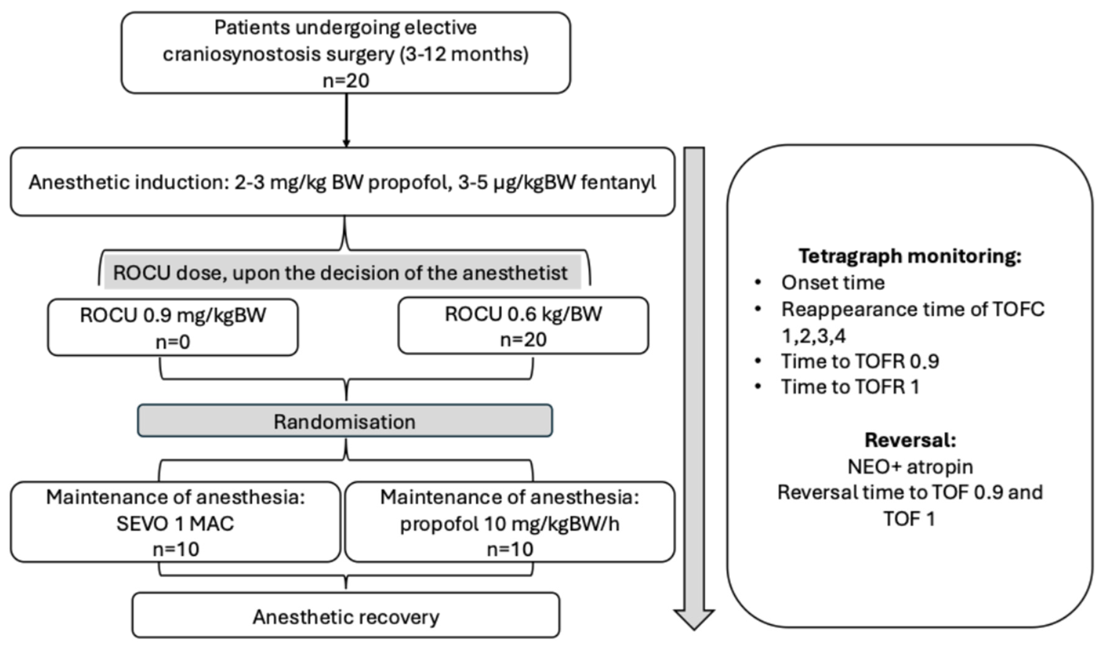 This is a prospectively randomized study performed in infants aged 4–12 months who were scheduled for elective craniosynostosis surgery at the Department of Neurosurgery, University of Debrecen, Hungary. The protocol of the study was approved by the local (Medical Ethics Committee of the University of Debrecen, DE RKEB/IKEB 6644-2023, approval date: 13 December 2023) and national (Medical Research Council Ethics Committee for Clinical Pharmacology, registration number: BM/21031-0/2024 EKL, approval date: 21 August 2024) authorities. The study was registered prior to patient inclusion at the Clinical Trials registry EUCT number: 2024-515545-41-00; registration date: 3 September 2024, url: