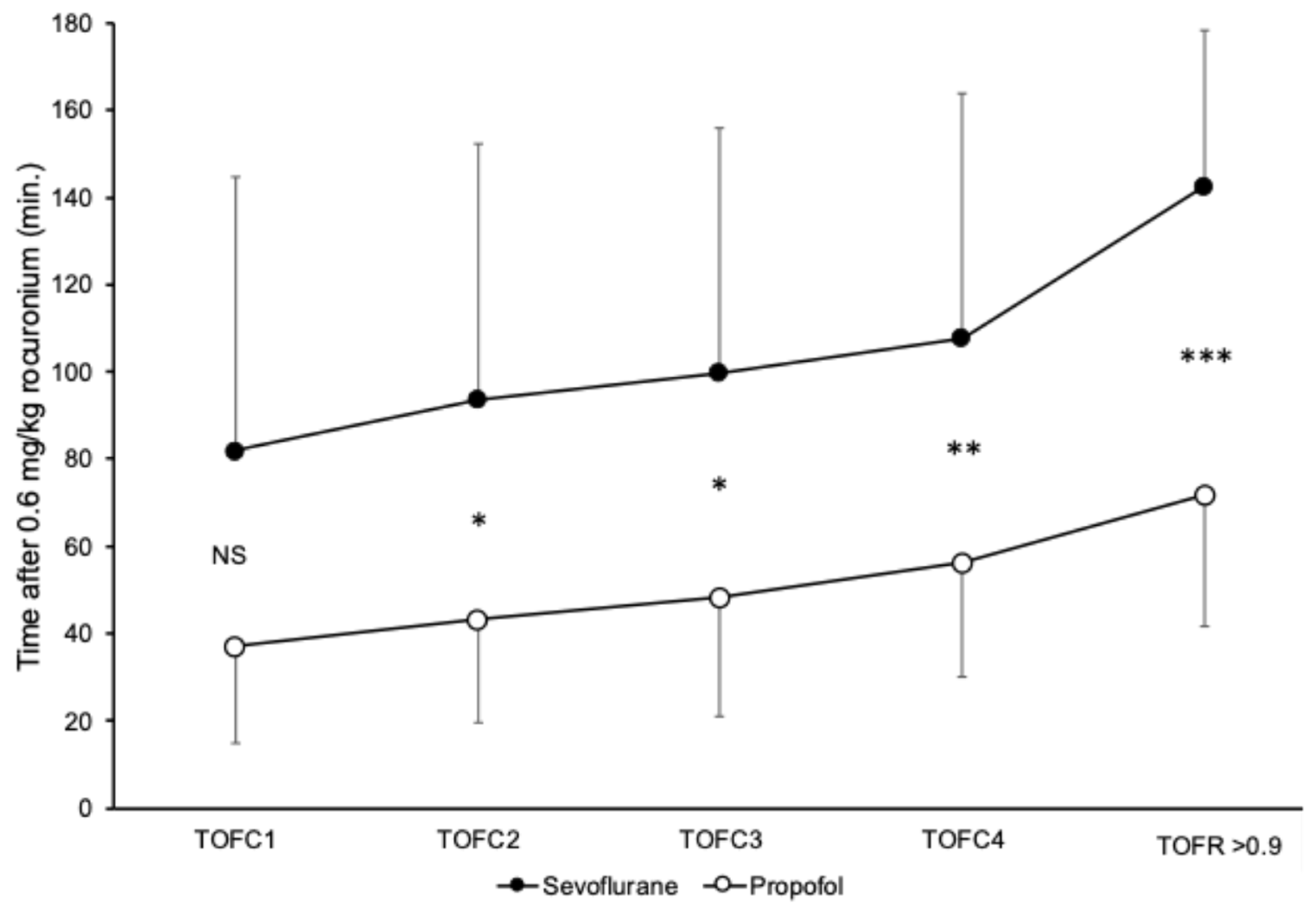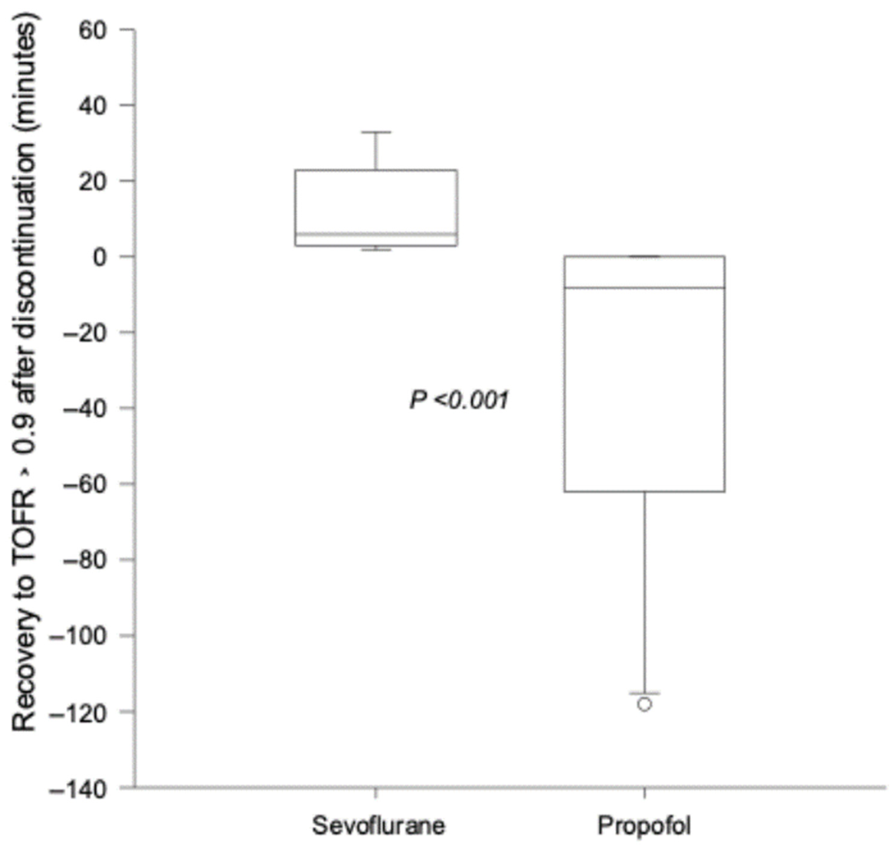 9]. In the adult population, a 103 min time to return to TOFR > 0.8 during sevoflurane maintenance, and a 62 min recovery time during propofol maintenance, were reported [