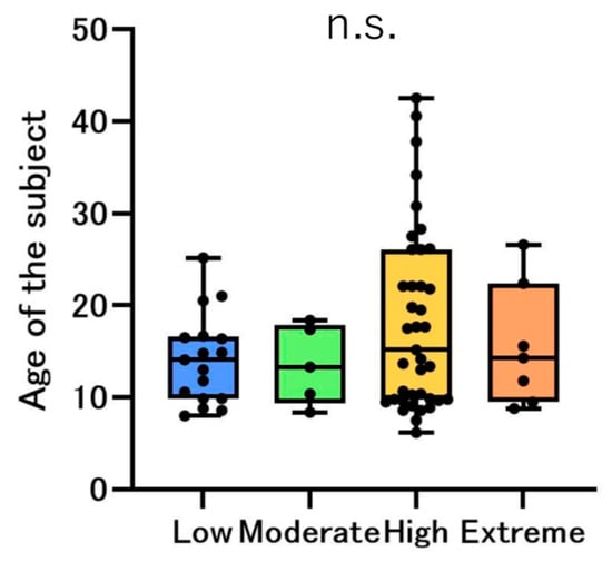 Age distribution of the participants by the risk group. The bar chart shows the median age of each risk group; blue, green, yellow, and orange represent the Low, Moderate, High, and Extreme risk groups, respectively. The black dots represent the distribution of each participant. No significant differences were observed between the risk groups (n.s.: not significant).