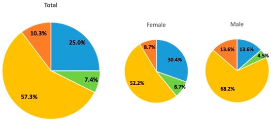 However, when comparing the median age by risk category, no statistically significant differences were found, suggesting no influence of medication on hyposalivation with increased age (Figure 1). The results of the distribution by risk group between females and males demonstrated that the combined proportion of those in the High and Extreme groups was 60.9% and 81.8% for females and males, respectively. Our previous research showed that males have poorer oral hygiene than females, and the sex difference observed in this study is consistent with these results [22]. Regarding the oral hygiene status and habits, PCR showed the highest value in the Extreme group; however, no statistically significant difference was observed between the groups (Figure 5a). The violin chart revealed that the Extreme group had the worst oral hygiene habits (Figure 5b). These results revealed that the Extreme group had poorer oral hygiene habits than the other groups. Orthodontic treatment is essentially considered in patients who are capable of maintaining good oral hygiene. Therefore, in our department, we provide oral hygiene instructions and begin orthodontic treatment only after improvement in the oral hygiene. It is possible that toothbrushing instructions provided at orthodontic clinics could improve oral hygiene [27,28]. Numerous studies have documented the importance of maintaining and improving daily oral hygiene in preventing the development of caries during orthodontic treatment [29].