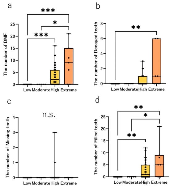 The median DMF index by risk groups. The bar chart shows the median number of decayed, missing, and filled (DMF) indices, where blue, green, yellow, and orange represent the Low, Moderate, High, and Extreme groups, respectively. The black dots represent the distribution of each participant. Comparison of the median number of (a) DMF, (b) D, (c) M, and (d) F teeth using the Kruskal–Wallis test. Significant differences are indicated by * p < 0.05, ** p < 0.01, *** p < 0.001 and n.s.: not significant.