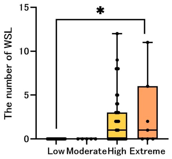 In this study, we considered a visible white spot that did not require restoration to be a WSL [18]. The median number of WSLs was 0 in the Low and Moderate groups but was 1.0 in the High and Extreme groups. Difference among groups was significant (p = 0.009). Dunn’s post hoc tests showed Extreme > Low (padj = 0.0023) (Figure 4).