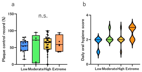 Oral hygiene condition by risk groups. The bar chart shows the median number of plaque control record (a) and the violin chart shows the oral hygiene habits (b), where blue represents the low group, green represents the moderate group, yellow represents the high group, and orange represents the extreme group. The black dots in the bar chart represent the distribution of each participant. However, the differences were not statistically significant (n.s.: not significant).