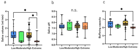 Salivary properties by risk groups. The bar chart shows the salivary properties; blue, green, yellow, and orange represents the Low, Moderate, High, and Extreme groups, respectively. The black dots represent the distribution of each participant. Comparison of the median number of (a) stimulated salivary secretion volumes, (b) saliva pH, and (c) salivary buffering capacity using the Kruskal–Wallis test. Significant differences are indicated by * p < 0.05 and n.s.: not significant.