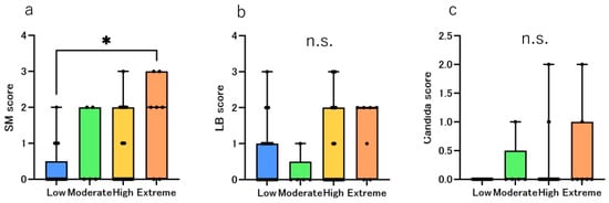 The Streptococcus mutans scores are shown in Figure 7a. The median Streptococcus mutans score in the Low, Moderate, and High groups was 0 but it was 2.0 in the Extreme groups. Difference among groups was significant (p = 0.0416). Dunn’s post hoc tests showed Extreme > Low (padj = 0.0258). This indicates a difference of more than 10 times in colony forming units (CFUs). The Lactobacillus scores are shown in Figure 7b. The median LB score in the Low, Moderate, and High was 0 but it was 2.0 in the Extreme groups. Although there were certain differences between the Extreme group and the other groups, the differences were not statistically significant. The results of the Candida albicans score are shown in Figure 7c. The median candida score was 0 in all the groups and no statistically significant differences were observed.