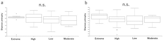 Alpha diversity (Shannon) across CAMBRA risk groups. Boxplots show median, interquartile range and IQR whiskers. (a) Plaque samples: Kruskal–Wallis H = 2.631, p = 0.452. (b) Saliva samples: Kruskal–Wallis H = 3.001, p = 0.391, n.s. indicates that the result was not significant.