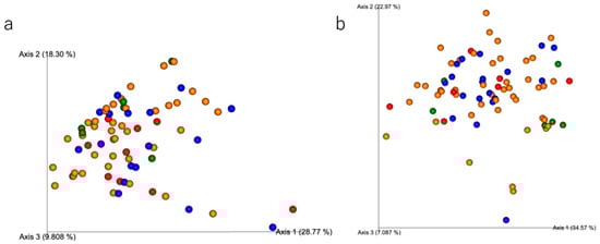 Shannon alpha diversity did not differ among the CAMBRA risk groups in the plaque samples (Kruskal–Wallis H = 2.631, p = 0.452) (Figure 8a). Similarly, Shannon alpha diversity did not differ among groups in the saliva samples (Kruskal–Wallis H = 3.001, p = 0.391) (Figure 8b). Beta diversity (PCoA of weighted UniFrac distance) of plaque samples did not show distinct clustering by risk groups (pseudo-F = 1.1618, p = 0.083) (Figure 9a). Similarly, beta diversity (PCoA of weighted UniFrac distance) of the saliva samples showed no variation by the risk groups (pseudo-F = 0.9385, p = 0.502) (Figure 9b). The bacterial structure at the genus level is shown in Figure 10. The relative abundance of oral bacteria was compared among the risk groups. In the stimulated saliva data, the genus Fusobacterium, which includes species of periodontopathogenic bacteria, had the highest relative abundance in the Low group, and this result was statistically significant (Figure 10a). The relative abundance ratios of in the Extreme group were the highest for Prevotella and lowest for Streptococcus, but the differences were not statistically significant. Considering the supragingival plaque data, the genus Actinomyces, which includes species of cariogenic bacteria, had the highest relative abundance in the Extreme-risk group; this result was statistically significant (Figure 10b). The microbiome differed between saliva and plaque samples, with the genera Leptotrichia, Capnocytophaga, and Actinomyces being more abundant in the plaque samples, and Prevotella, Neiserria, and Haemophilus being more abundant in the saliva samples.