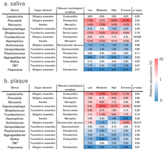 Bacterial population structure at the genus level. Heat maps of the relative abundance of bacteria in the supragingival saliva (a) and plaque (b) samples of each risk group. The oxygen demands and relevant pathological conditions of the pathogenic bacteria are described. The Kruskal–Wallis test was used, and significant differences are indicated by * p < 0.05.