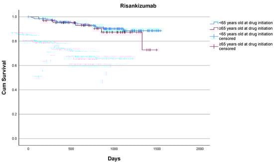 Overall, 7/64 (10.9%) elderly patients vs. 16/191 (8.4%) non-elderly patients discontinued risankizumab. No statistically significant differences were noted (p = 0.469) according to the log-rank test.