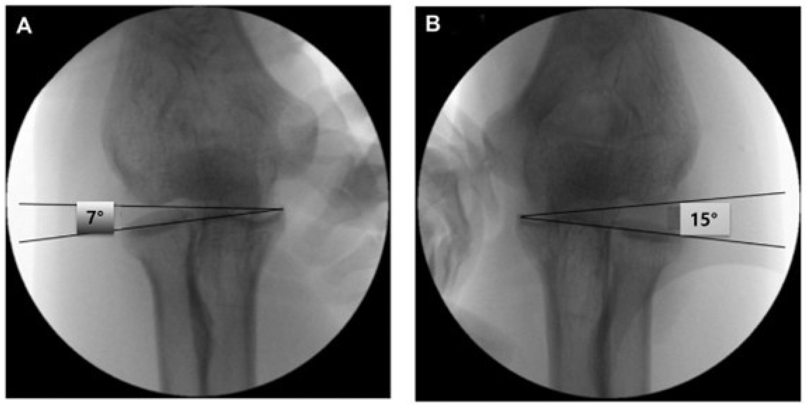 - A capitellum–sublime tubercle–radial head angle (CSRA) greater than 5° compared with the contralateral side. (Figure 2) This threshold was adopted based on previous studies that demonstrated its diagnostic utility in detecting subtle lateral elbow instability [13]. The CSRA measurement reflects subtle changes in joint alignment, aiding diagnosis of minor instability in this population.