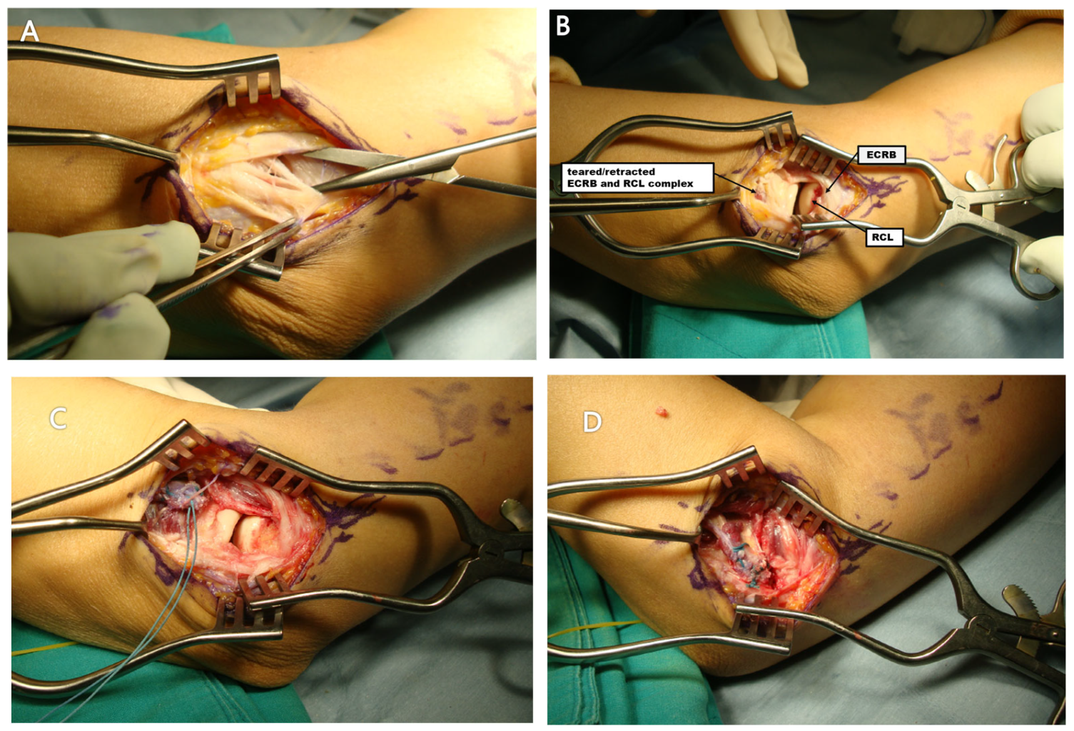- Noh, Y.M.; Kong, G.M.; Moon, S.W.; Jang, H.S.; Kim, S.; Bak, G.G.; Kim, Y. Lateral ulnar collateral ligament (LUCL) reconstruction for the treatment of recalcitrant lateral epicondylitis of the elbow: A comparison with open debridement of the extensor origin. JSES Int. 2021, 5, 578–587. [Google Scholar] [CrossRef] [PubMed]