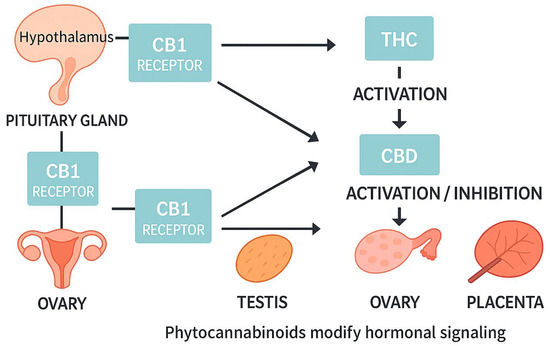 The endocannabinoid system (ECS) comprises a series of interconnected components, including endogenous cannabinoids, cannabinoid receptors, and the enzymes responsible for their synthesis and degradation. These receptors are distributed across both the central and peripheral nervous systems [12]. In addition to their fundamental functions, cannabinoid receptors act as targets for THC, a psychoactive substance present in cannabis. These receptors are distributed throughout the body, with the most well-known, cannabinoid receptor type 1 (CB1) and type 2 (CB2), found in both the central and peripheral nervous systems. CB1 receptors are localized in the hypothalamus and pituitary gland, which are key components of the reproductive neuroendocrine axis, as well as in peripheral organs such as the ovary, testis, and placenta. (Figure 1). Endogenous cannabinoids play a key role in regulating many physiological and cognitive processes [13,14]. The two main compounds found in cannabis are THC and cannabidiol (CBD). THC acts as a partial agonist at CB1 and CB2 receptors, showing high affinity for CB1, which is responsible for its psychoactive effects [15]. CBD, a non-psychoactive phytocannabinoid found in cannabis, has a complex, multidirectional mechanism of action. It has been demonstrated to influence a variety of physiological systems, including the cannabinoid, serotonergic, and opioid systems. However, its affinity for CB1 and CB2 receptors is comparatively low. Within the cannabinoid system, its mechanism of action may involve negative allosteric modulation [16].