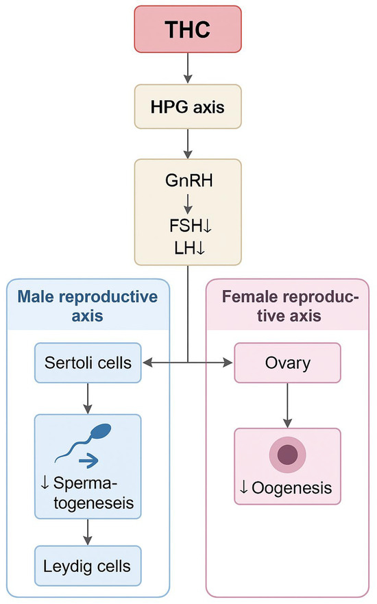 Schematic representation of the mechanisms by which tetrahydrocannabinol (THC) disrupts the hypothalamic-pituitary-gonadal (HPG) axis, leading to altered levels of gonadotropin-releasing hormone (GnRH), follicle-stimulating hormone (FSH), and luteinizing hormone (LH). These changes impair the function of Sertoli and Leydig cells in males—leading to reduced spermatogenesis—and disrupt follicular development and oogenesis in females. The diagram delineates the male and female reproductive axes in response to THC exposure. ↓—decrease.