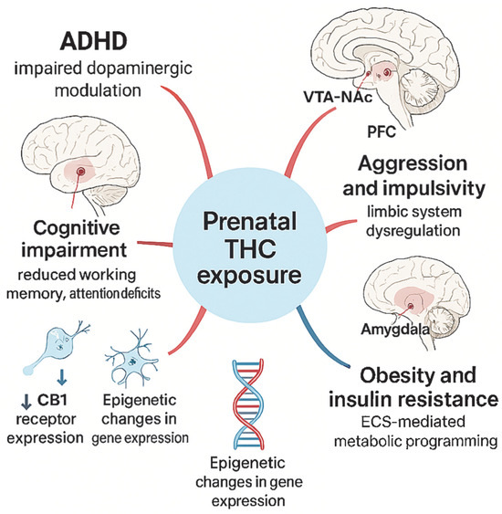 Furthermore, exposure to cannabis during pregnancy has been associated with an elevated risk of depression, anxiety disorders, and disruptions to bedtime rhythms, including sleep problems, in children exposed to the substance [54]. Prenatal cannabis exposure can lead to several serious health effects on offspring, including metabolic disorders. Prenatal exposure to cannabis has been linked to an increased risk of obesity and elevated fasting glucose levels in childhood in children whose mothers used it during pregnancy [55,64]. Figure 3 illustrates the proposed mechanisms linking prenatal THC exposure with long-term neurobehavioral and metabolic effects.