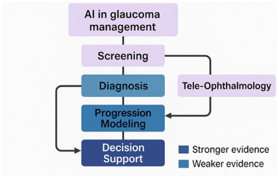 - Martucci, A.; Gallo Afflitto, G.; Pocobelli, G.; Aiello, F.; Mancino, R.; Nucci, C. Lights and shadows on artificial intelligence in glaucoma: Transforming screening, monitoring, and prognosis. J. Clin. Med. 2025, 14, 2139. [Google Scholar] [CrossRef]