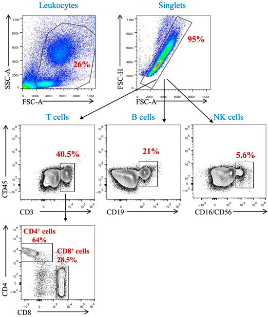 Gating strategy for the identification of immune population (T-cells, B-cells, and NK cells) in peripheral blood.