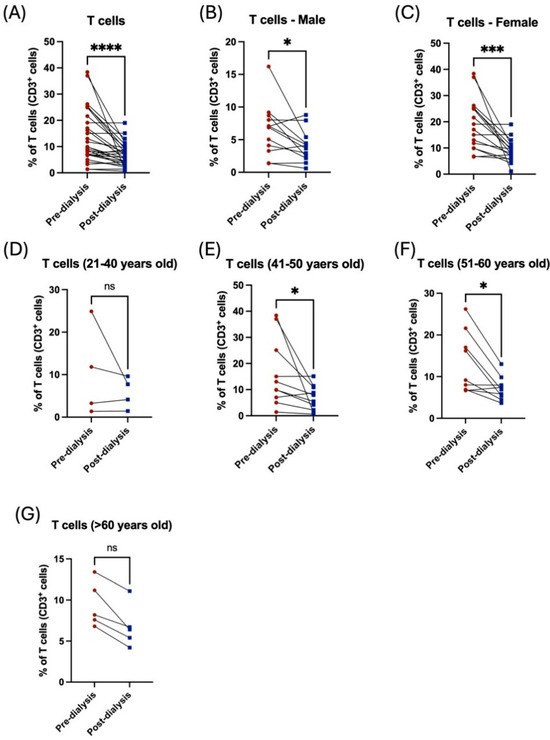 Interestingly, there was a noticeable reduction in peripheral CD3+ T-cells after dialysis (Figure 2A). The proportion of total T lymphocytes was significantly affected by dialysis among both male and female patients (Figure 2B,C, Table 2). Middle-aged patients (41–60 years old) showed a significant reduction in total T-cells post dialysis session (Figure 2E,F, Table 3). However, the younger cohort, those younger than 40 years, and those older than 60 years, showed a noticeable decrease in T-cell population, but this was non-significant (Figure 2D,G, Table 3).
