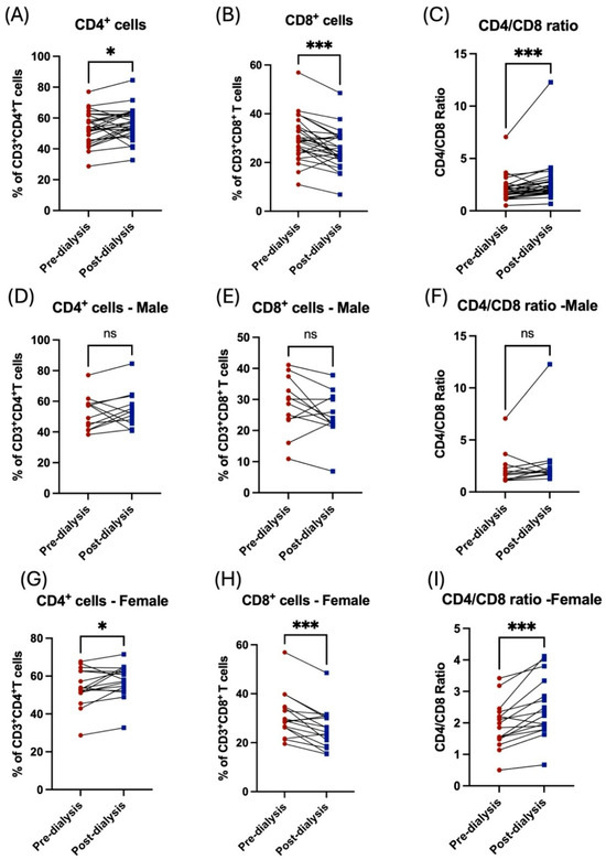 The impact of hemodialysis on T lymphocyte subpopulation (CD4+ and CD8+ T-cells) based on gender stratification. (A) Percentage of total CD4+ T-cells before and after dialysis among participants. (B) Percentage of total CD8+ T-cells before and after dialysis among participants. (C) Ratio of CD4/CD8 before and after dialysis among participants. (D) Percentage of total CD4+ T-cells before and after dialysis among male patients. (E) Percentage of total CD8+ T-cells before and after dialysis among male patients. (F) Ratio of CD4/CD8 before and after dialysis among male patients. (G) Percentage of total CD4+ T-cells before and after dialysis among female patients. (H) Percentage of total CD8+ T-cells before and after dialysis among female patients. (I) Ratio of CD4/CD8 before and after dialysis among female patients. * < 0.05, *** < 0.001, ns = non-significant.
