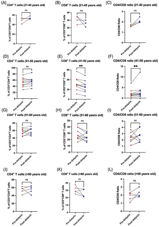 The impact of hemodialysis on T lymphocyte subpopulation (CD4+ and CD8+ T-cells) based on age stratification. (A) Percentage of total CD4+ T-cells before and after dialysis among 21–40 year-old patients. (B) Percentage of total CD8+ T-cells before and after dialysis among 21–40 year-old patients. (C) Ratio of CD4/CD8 before and after dialysis among 21–40 year-old patients. (D) Percentage of total CD4+ T-cells before and after dialysis among 41–50 year-old patients. (E) Percentage of total CD8+ T-cells before and after dialysis among 41–50 year-old patients. (F) Ratio of CD4/CD8 before and after dialysis among 41–50 year-old patients. (G) Percentage of total CD4+ T-cells before and after dialysis among 51–60 year-old patients. (H) Percentage of total CD8+ T-cells before and after dialysis among 51–60 year-old patients. (I) Ratio of CD4/CD8 before and after dialysis among 51–60 year-old patients. (J) Percentage of total CD4+ T-cells before and after dialysis among >60 years old patients. (K) Percentage of total CD8+ T-cells before and after dialysis among >60 year-old patients. (L) Ratio of CD4/CD8 before and after dialysis among >60 year-old patients. ** < 0.01, ns = non-significant.