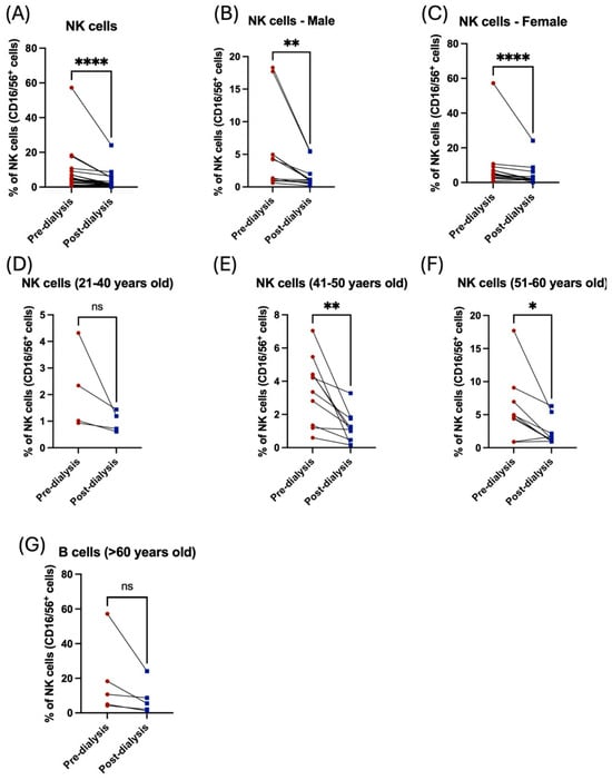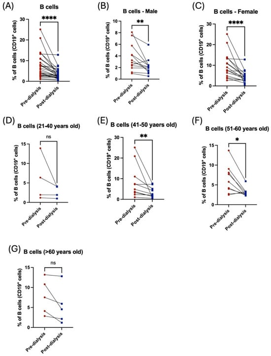 Analysis of CD19+ B lymphocytes exhibited a statistically significant decrease in the proportion of B lymphocytes post hemodialysis (Figure 5A). Noticeably, both male and female patients showed a reduction in the percentage of such cells; however, female patients were more affected by dialysis than male patients (Figure 5B,C, Table 2). Patients aged between 41 and 60 years showed a significant reduction in the percentage of B lymphocytes (Figure 5E,F, Table 3), while younger and older patients showed a non-significant decrease in B-cells (Figure 5D,G, Table 3).