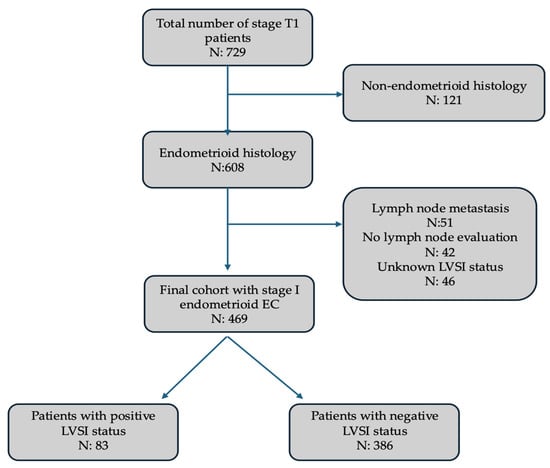 - Dagher, C.; Bjerre Trent, P.; Alwaqfi, R.; Davidson, B.; Ellenson, L.H.; Zhou, Q.; Iasonos, A.; Mueller, J.J.; Alektiar, K.; Makker, V.; et al. Effect of substantial lymphovascular space invasion on location of first disease recurrence in surgical stage I endometrioid endometrial adenocarcinoma. Int. J. Gynecol. Cancer 2025, 35, 101651. [Google Scholar] [CrossRef]