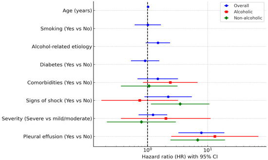 In the overall cohort, pleural effusion (HR 7.88, 95% CI 3.27–18.99, p < 0.001) and age (HR 1.02, 95% CI 1.00–1.03, p = 0.026) remained independent predictors of mortality in the multivariable model. In the alcoholic subgroup, pleural effusion was the only independent predictor (HR 13.19, 95% CI 2.48–70.08, p = 0.002). In the non-alcoholic subgroup, both pleural effusion (HR 6.83, 95% CI 2.40–19.44, p < 0.001) and signs of shock (HR 3.49, 95% CI 1.14–10.71, p = 0.029) were significant independent predictors.