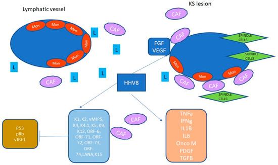 In the figure, HHV-8 acts in the endothelial tissue to activate inflammation and several proliferative pathways that result in further activation of many additional kinases and transcription factors. HHV-8 establishes latency within 24 h post-infection, and the late proteins allow the complete morphogenesis of the virion. HHV-8 stimulates FGF and VEGF and induces a proinflammatory environment. T cells, macrophages, and dendritic cells are involved in the production of cytokines, chemokines, and interferon, in particular IL-1, IL-6, and TNFa. An HHV-8 protein, the viral interferon regulatory factor-1 (vIRF-1) blocks the host’s interferon, inhibiting virus-induced apoptosis. Other proteins are involved in endothelial cell transformation and angiogenesis. Abbreviations: interferon-inducible factor, IRF; cancer-associated factor, CAF; vascular endothelial growth factor, VEGF; fibroblast growth factor, FGF; lymphocyte, L; interleukin, IL; latency-associated nuclear antigen, LANA; monocyte, Mon; platelet-derived growth factor, PDFG; tumor growth factor, TGF; open reading frame, ORF.