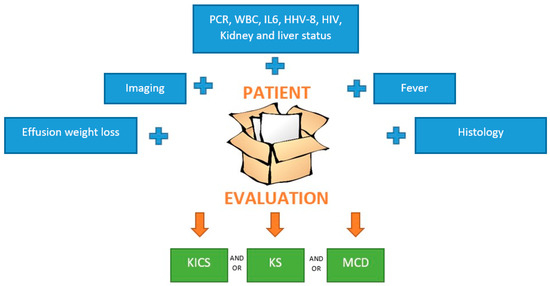 Patients’ evaluation. The first step is clinical evaluation, past medical history, blood tests, and imaging. Each element in the blu rectangol should be evaluated. If MCD or KS is suspected, a biopsy must be performed; then, dermatologic and endoscopy evaluation must be ordered. The multidisciplinary team is fundamental to ensure the correct management, and anti-cancer therapies should be started as soon as possible. Abbreviations: PCR, C-reactive protein; WBC, white blood cell; IL, interleukin-6; HHV human herpes virus; HIV human immunodeficiency virus.