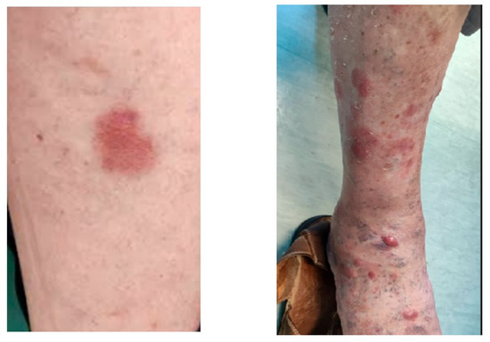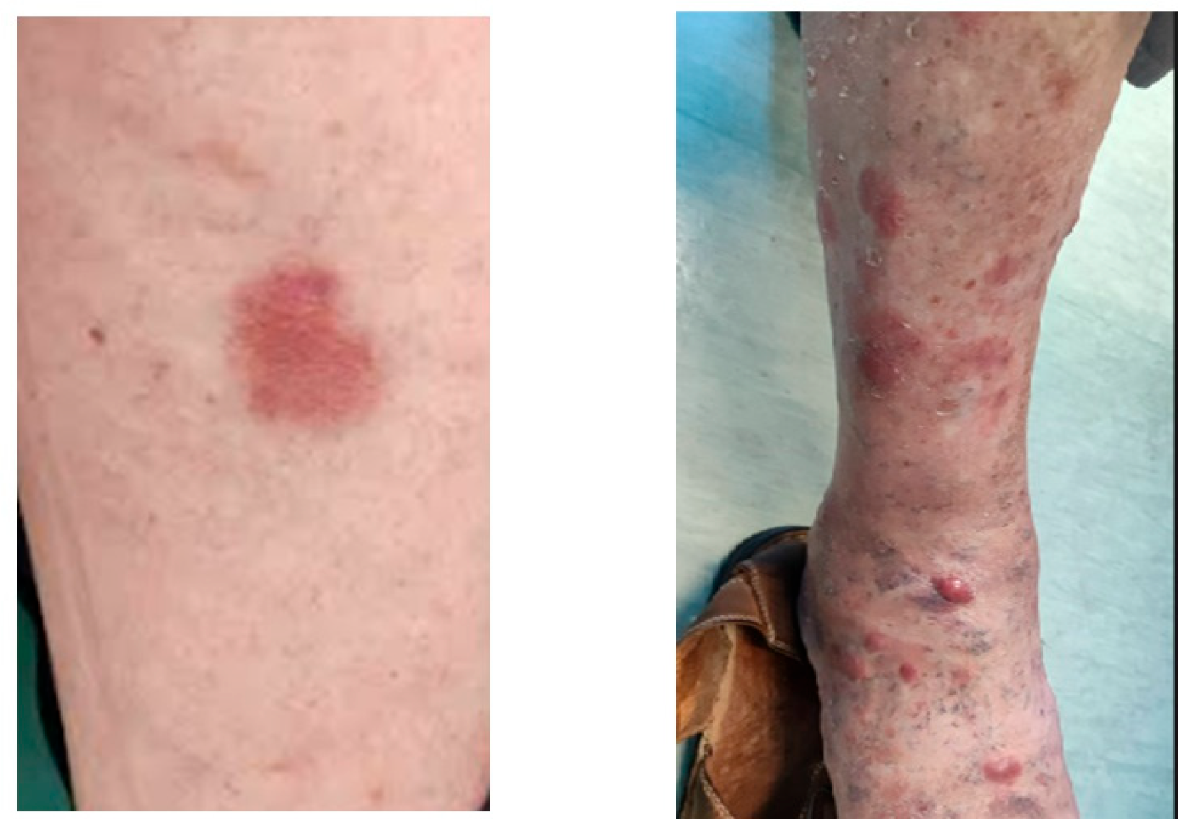 - Denaro, N.; Indini, A.; Brambilla, L.; Marzano, A.V.; Garrone, O.; Tourlaki, A. Management and Future Therapeutic Perspectives of Classic Kaposi’s Sarcoma: An Evidence-Based Review. Onco Targets Ther. 2024, 17, 961–976. [Google Scholar] [CrossRef]