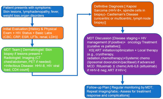 Due to diagnostic delays and limited treatment options, KICS is associated with high mortality rates. Several case reports describing fatal outcomes in patients with KICS, or with overlapping KS and MCD, highlight the complexities of diagnosis and management, particularly in non-tertiary care settings, where access to a multidisciplinary team is often limited but crucial for optimal outcomes [40]. In our experience, the core multidisciplinary team should include dermatologists, oncologists, infectious disease specialists, and hematologists. Additional input from radiation oncologists, surgeons, dietitians, psychologists, and radiologists may also be required, depending on the clinical scenario.