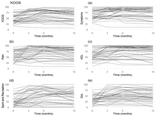 Profile plots for the Knee injury and Osteoarthritis Outcome Score (KOOS) scale and its subscales: (a) Symptoms, (b) Pain, (c) Activities of Daily Living (ADL), (d) Sport and Recreation, and (e) Quality of Life (QoL).