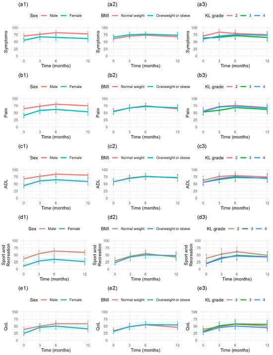 Mean scores for KOOS subscales (a) Symptoms, (b) Pain, (c) ADL, (d) Sports and Recreations, and (e) QoL; stratified by (1) Sex, (2) BMI, and (3) KL grade.