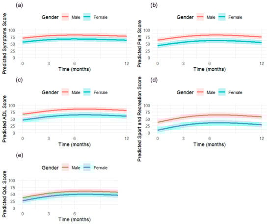 Predicted subscale scores over time by sex for (a) Symptoms, (b) Pain, (c) Activities of Daily Living (ADL), (d) Sport and Recreation, and (e) Quality of Life (QoL).