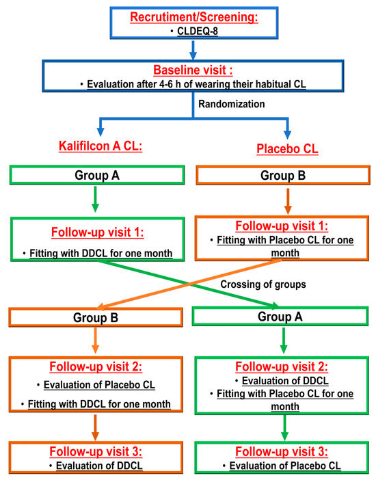 Participants were randomized into two groups (two sequences). One group was refitted with Kalifilcon A CLs (ULTRA® One Day, Bausch & Lomb Inc., Rochester, NY, USA), while the other was refitted with a masked pair of their habitual CLs (Figure 1) to balance potential period effects.