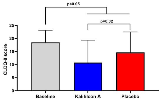 After one month of wearing the Placebo CLs, the mean total score on the CLDEQ-8 questionnaire showed a statistically significant reduction from the baseline (15.0 ± 7.5 compared to 18.5 ± 4.6; p < 0.05; Cramer’s V: 0.594; 95% CI: 13.35–15.34; Figure 2). Considering that 100% of the participants were symptomatic at the beginning of this study, after one month of using the placebo CLs, 40% became non-symptomatic, indicating a placebo effect.