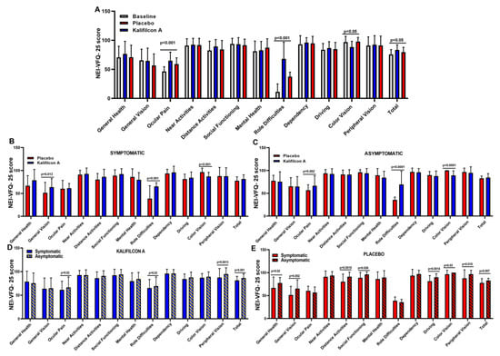 Mean values of the score obtained in the NEI-VFQ-25 test, dividing the participants according to the CL used (A), according to result obtained in the CLDEQ-8 test in symptomatic (B), or non-symptomatic (C), and according to the results obtained in the CLDEQ-8 and with which CL they have been refitted, Kalifilcon A DDCLs (D) or Placebo CLs (E). Student’s t-test.