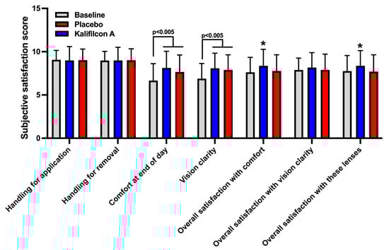 It was observed that there were no significant differences between CL types regarding ease of handling and insertion/removal (p > 0.5). However, Kalifilcon A DDCLs were found to demonstrate significantly higher comfort, sharpness, and satisfaction scores in comparison to baseline (p < 0.01). Placebo CLs exhibited intermediate results. The differences in satisfaction with sharpness were found to be statistically significant only between Kalifilcon A DDCLs and baseline (p = 0.029).