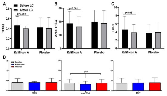 The clinical evaluation of the auto-tear break-up time showed a significant reduction in TFSQ (p = 0.002; Cohen’s d: 0.184; 95% CI: 0.34–0.58), A-TFSQ (p < 0.001; Cohen’s d: −0.055; 95% CI: 33.06–41.56), and TBUT (p < 0.05; Cohen’s d: 0.216; 95% CI: 3.81–4.75) after one month refitted with Kalifilcon A DDCLs (Figure 5).