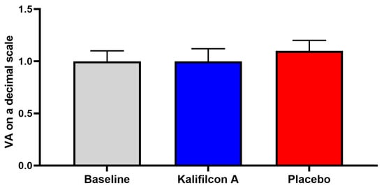 The mean total score obtained with the CLDEQ-8 questionnaire demonstrated a statistically and clinically significant reduction when the participants were refitted with Kalifilcon A DDCLs in comparison to Placebo CLs (10.8 ± 8.5 and 15.0 ± 7.5; p = 0.02; Cramer’s V: 0.594; 95% CI: 13.35–15.34; Figure 2). This reduction in symptomatology was also reflected in a statistically significant improvement in vision-related quality of life as measured using the NEI VFQ-25 questionnaire. The overall score was 79.67 ± 8.1 (95% CI: 78.57–80.81) with Placebo CLs and 83.5 ± 8.6 with the Kalifilcon A DDCLs (p = 0.004; Cramer’s V:0.977; 95% CI: 81.46–85.45; Figure 3). More specifically, participants refitted with Kalifilcon A DDCLs indicated better feedback on ocular pain (p < 0.001; Cramer’s V: 0.755; 95% CI: 54.73–58.88), role difficulties (p < 0.001; Cramer’s V: 0.812; 95% CI: 35.12–42.77), and color vision (p < 0.05; Cramer’s V: 0.575; 95% CI: 93.07–95.63).