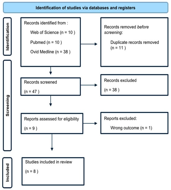 A total of 58 studies were initially identified: 10 from PubMed, 38 from Ovid Medline, and 10 from Web of Science. After screening titles and abstracts, nine studies were chosen for full-text review, of which eight fulfilled all the inclusion criteria (Figure 1) [,,,,,,,].