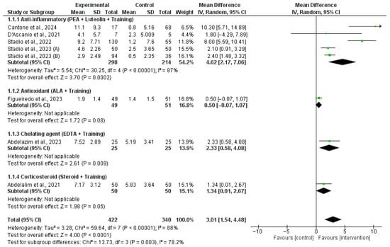 When measuring changes in olfactory function as a continuous outcome (Figure 2), our pooled analysis of mean differences in post-intervention olfactory scores further supported the efficacy of certain combination therapies. The most pronounced improvement was seen with PEA and luteolin combined with olfactory training, which significantly increased olfactory scores compared to controls (MD = 4.62, 95% CI: 2.17–7.06, p = 0.0002) despite a high level of heterogeneity (I2 = 87%). The addition of EDTA to training also led to a significant improvement in olfactory function (MD = 2.33, 95% CI: 0.58–4.08, p = 0.009). While the use of corticosteroids showed a borderline significant benefit (MD = 1.34, 95% CI: 0.01–2.67, p = 0.05), ALA supplementation did not significantly enhance olfactory recovery (MD = 0.50, 95% CI: −0.07–1.07, p = 0.08). Overall, the combined mean difference for all interventions was statistically significant at 3.01 (95% CI: 1.54–4.48, p < 0.0001).