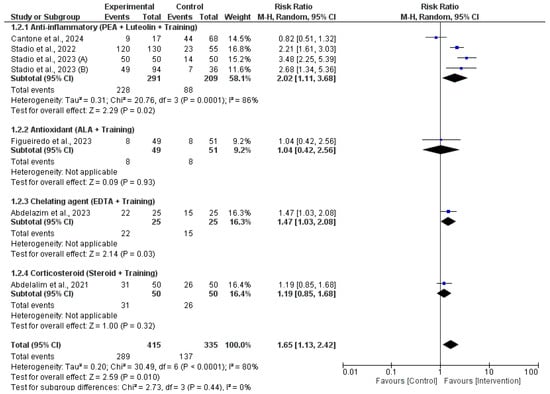 Our meta-analysis of recovery rates (Figure 3) demonstrated that several adjunct therapies combined with olfactory training significantly improved the likelihood of recovery from olfactory dysfunction when compared to training alone. Among these, anti-inflammatory interventions using ultramicronized palmitoylethanolamide (PEA) and luteolin in combination with olfactory training showed statistically significant benefits, with a pooled RR of 2.02 (95% CI: 1.11–3.68, p = 0.02), though heterogeneity was substantial (I2 = 86%). Similarly, the use of a chelating agent (EDTA) with training was also effective, yielding an RR of 1.47 (95% CI: 1.03–2.08, p = 0.03). In contrast, antioxidant therapy with alpha-lipoic acid (ALA) did not demonstrate a significant benefit (RR = 1.04, 95% CI: 0.42–2.56, p = 0.93), nor did the combination of corticosteroids with olfactory training (RR = 1.19, 95% CI: 0.85–1.68, p = 0.32). The overall pooled effect across all studies favored the intervention group, with a statistically significant combined RR of 1.65 (95% CI: 1.13–2.42, p = 0.01), indicating a 65% greater chance of recovery in patients receiving additional interventions beyond olfactory training alone.