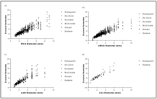 Six Z score formulas (Kobayashi [14], de Zorzi [10], Kurotobi [15], McCrindle [16], Olivieri [17] and Dallaire [18]) were applied on all the available CA diameters. These models were selected based on their widespread use. Z scores were calculated for the proximal segments of the right coronary artery (RCA), left main coronary artery (LMCA), and left anterior descending artery (LAD). For the left circumflex artery (LCx), only the Kobayashi and Dallaire models provide Z score estimations.