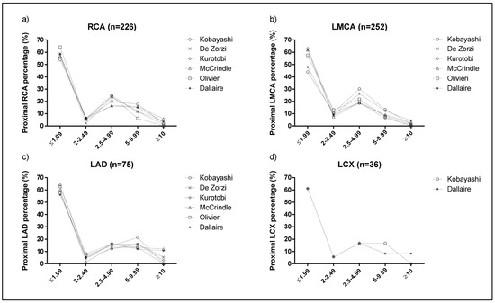 Based on Cohen’s Kappa coefficient, Kobayashi and Dallaire showed substantial to almost perfect agreement across all dimensions, particularly for LMCA and LCx (Table 4). Similarly, de Zorzi and Kurotobi demonstrated high levels of agreement. McCrindle and Dallaire also exhibited almost perfect levels of agreement in RCA and LAD, although only a moderate agreement was seen in LMCA. The lowest level of agreement was observed between Kobayashi and Kurotobi in LMCA. Olivieri and Dallaire did not indicate a high level of agreement in any of the dimensions.