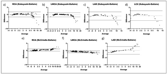 Bland–Altman plots comparing two pairs of Z scores formulas across the CA segments (RCA, right coronary artery; LMCA, left main coronary artery; LAD, left anterior descending; LCx, left circumflex): For each CA, the differences were calculated by subtracting Kobayashi’s values from Dallaire’s values (a–d), and McCrindle’s values from Dallaire’s values (e–g). The dotted line represents the average difference in Z scores, and the solid lines represent the limits of agreement for the average difference in Z scores.
