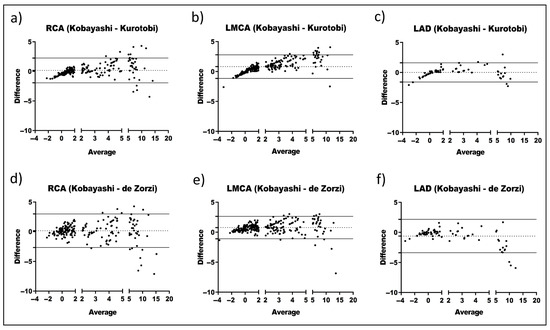 Bland–Altman plots comparing two pairs of Z scores formulas across the CA segments (RCA, right coronary artery; LMCA, left main coronary artery; LAD, left anterior descending): For each CA, the differences were calculated by subtracting Kobayashi`s values from and Kurotobi’s values (a–c) and Kobayashi’s values from de Zorzi’s values (d–f). The dotted line represents the average difference in Z scores, and the solid lines represent the limits of agreement for the average difference in Z scores.