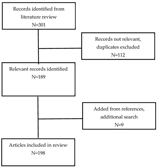 A literature search was carried out by a university librarian at the University of Arkansas for Medical Sciences (UAMS). The search engines used were PUBMED, CINAHL, and Embase. The search terms used were “healthy lifestyle” OR “life style” AND “fertility” OR “preconception care” OR “pre-pregnancy care” OR “pregnancy preparation”. The search was limited to the English language, and the years searched were 1990 to 5/3/2024. The authors independently reviewed the literature search for relevant abstracts. A total of 301 abstracts were identified. The full papers of the abstracts that were relevant to lifestyle modifications or pre-pregnancy preparations in anticipation of becoming pregnant were obtained and read. After removing duplicate papers and papers not relevant to this review, we determined that 189 articles contained applicable information for this review. The references for these full articles were examined for any additional applicable articles. A final total of 198 articles were identified and became the basis of this review (Figure 1).