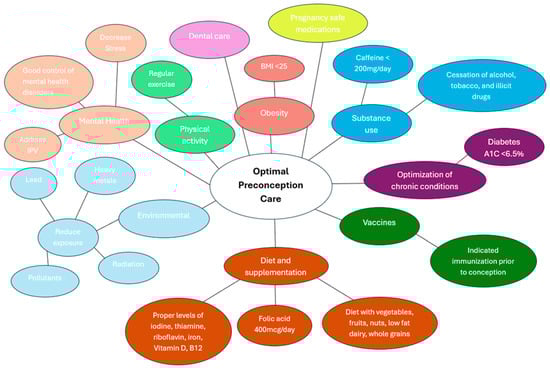 - National Institute of Child Health and Human Development. Preconception Care. 2023. Available online: https://www.nichd.nih.gov/health/topics/factsheets/preconceptioncare (accessed on 27 October 2024).