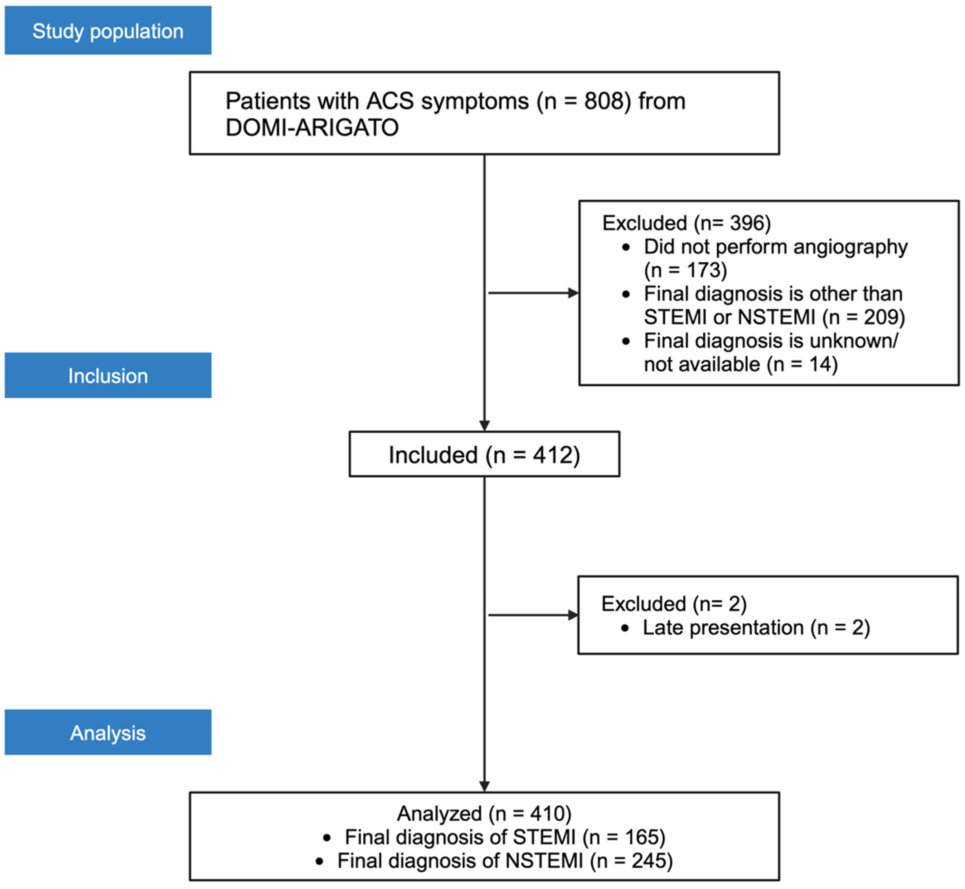 Figure 1). Within this cohort, 165/410 (40.2%) were assigned a final diagnosis of STEMI and 245/410 (59.8%) a final diagnosis of NSTEMI. Baseline demographics and clinical features are summarized in