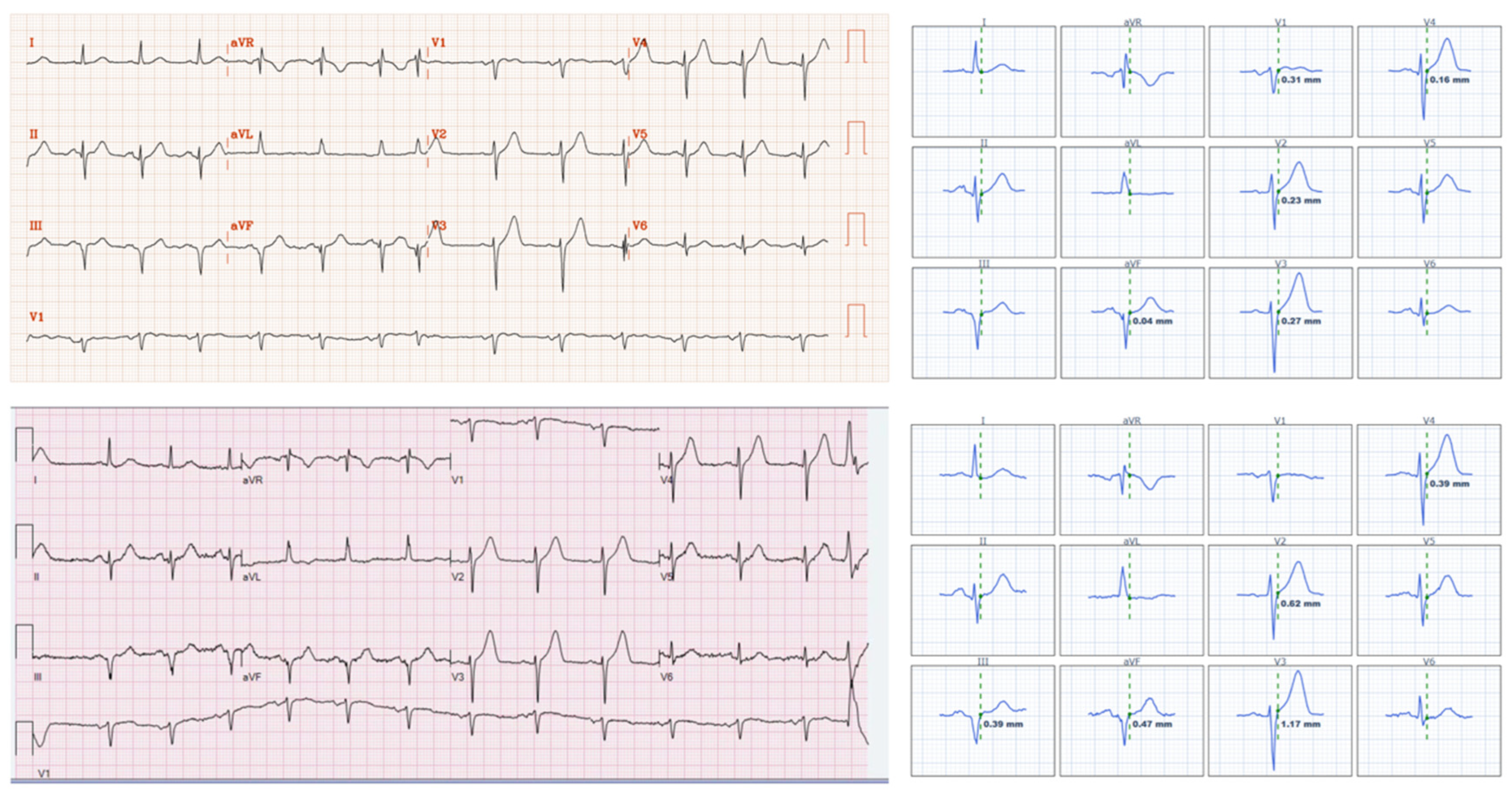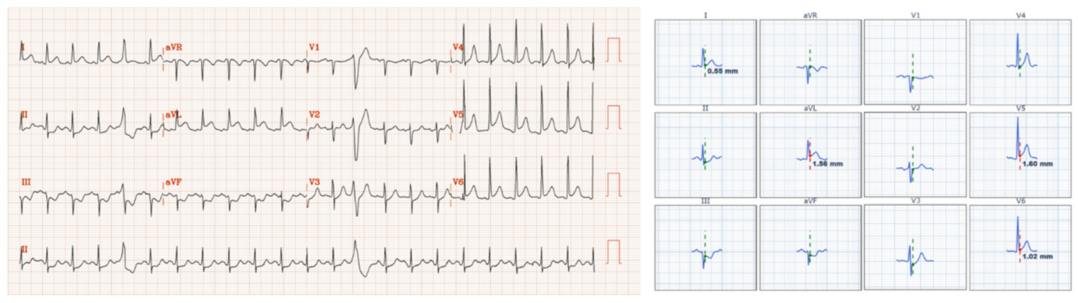 To standardize definitions, an ECG was classified as STEc+ if it met the STEMI criteria as per the Fourth Universal Definition of Myocardial Infarction, which define STE as new ST-segment elevation at the J-point in two or more contiguous leads with the following cutoffs:
